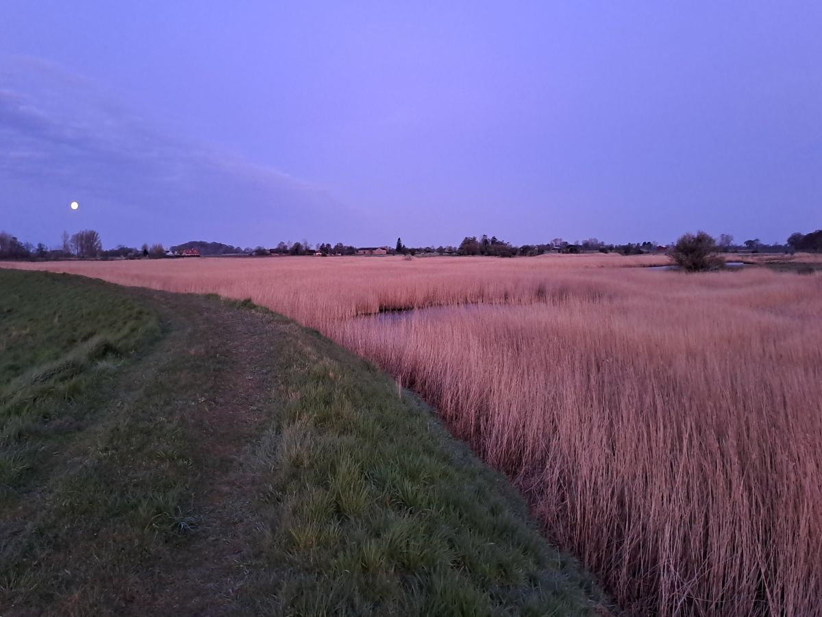 Det var for fedt! Jeg satte mig ved diget og nød sangen og rushet ved at finde min egen lolliske Blåhals! Det var stadig mørkt, så efter lidt tid besluttede jeg mig for at gå tilbage til bilen og hente kameraet, og så håbe på, at jeg kunne få billeder af fuglen, når solen stod op. Inden da fik jeg dog lige meldt den ud på Bird Alarm. Den næste times tid blev det gradvis lysere, og jeg forsøgte at få fuglen at se, men det lykkedes kun meget kortvarigt et par gange, hvor den lige var oppe og svirre over rørene. Ellers holdte den sig meget skjult, og bevægede sig en del frem og tilbage på strækningen. Til sidst opgav jeg at få billeder af den, og kørte videre til Hyllekrog med en fantastisk følelse i maven. Sikke en start på dagen!