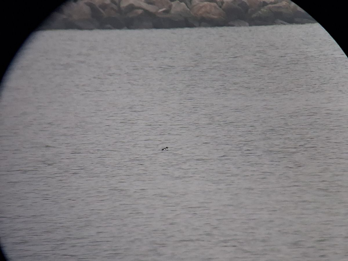 Vi tog teleskoperne frem og begyndte at scanne det store havnebassin. Solen var så småt ved at stå op, så lyset var udmærket, og da der næsten var vindstille, var der god mulighed for at spotte fuglen, selvom den er ret så lille.