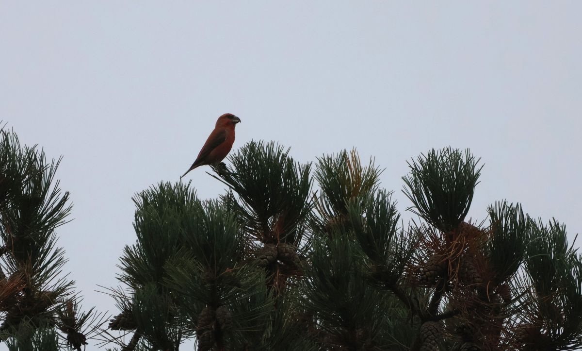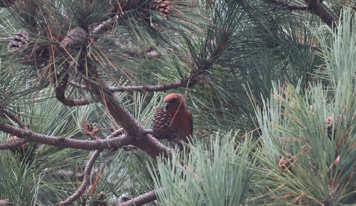 Jeg begyndte at være lidt sulten, så jeg sagde til Jakob, at jeg lige ville smutte i bilen efter en mad. Det viste sig at være en god ide, for lige da jeg trådte ind på p-pladsen, hørte jeg et “dyb dyb” fra noget, som jeg virkelig syntes lød som Stor Korsnæb. Jeg fik kikkerten til øjnene og fandt ret hurtigt en flot rød han i det tætteste fyrretræ! Der var den sgu! Jeg fik hurtigt ringet til Jakob, som kort efter kom hen til stedet. Det virkede til, at der var 2-3 fugle, men de gemte sig godt inde i fyrretræet, og var svære at se. Pludselig virkede det også til, at de var væk. Vi aftalte, at dele os op, så Jakob gik ind på campingpladsen, imens jeg blev på p-pladsen, og så kunne vi stille og roligt gå mod syd og prøve at finde fuglene. Jakob nåede dog kun ind på campingpladsen, før han kaldte på mig, da han havde fundet korsnæbbene i et fyrretræ inde på pladsen. Her kunne vi nyde synet af to hanner og en hun, som lystigt fouragerede på fyrrekoglerne.