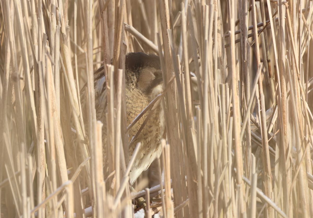 Vi blev ved med at scanne rørskoven igennem, og bevægede os også lidt rundt for at få lidt andre vinkler på rørskoven. Efter en halv times tid snakkede vi om at tage videre til Stigbordet. Jeg besluttede mig for at scanne rørskoven en sidste gang, og da jeg var nået næsten helt til venstre med kikkerten, kunne jeg pludselig konstatere en Rørdrum mellem tagrørene!