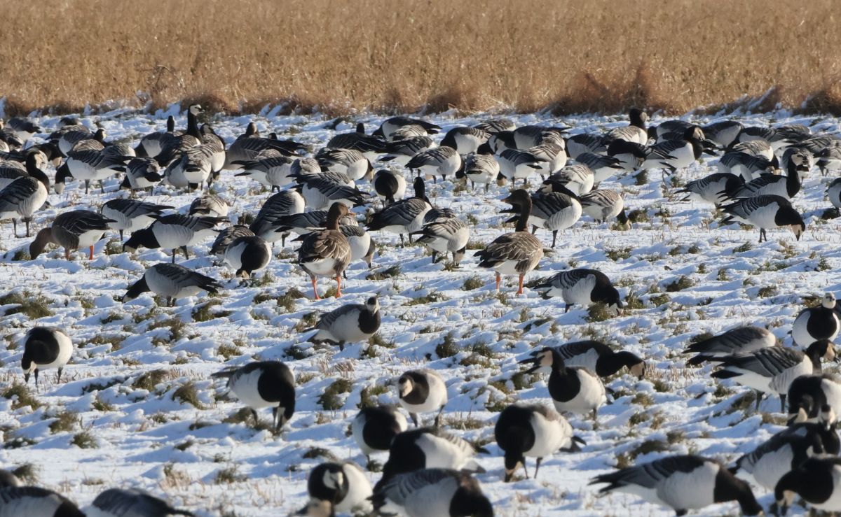 Jeg elsker at stå og tjekke en stor gåseflok igennem i godt lys, og da der løbende kom nye gæs til, hyggede jeg mig gevaldigt. Jeg talte omkring 4.000 Bramgæs i flokken, som derudover også havde lidt Blisgæs, Grågæs og Tajgasædgæs. Men desværre kunne jeg ikke finde nogen Rødhalset Gås, som var det store mål med gennemgangen.