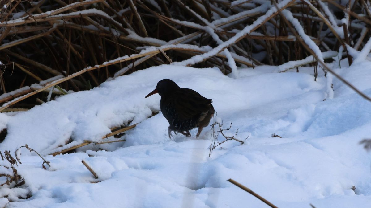 Lørdag d. 14. februar, havde vi overnattet hos mine svigerforældre i Maribo. Der var set Rørdrum ved Nørresø tidligere på ugen, så jeg havde aftalt med min mor, at vi tog en lille formiddagstur for at kigge efter den. Fuglen var set ved åens indløb i søens sydlige del, så vi startede selvfølgelig der. Det var koldt, men solen skinnede og der blæste kun en let vind, så det var en fornøjelse at være ude. Ankommet til stedet kunne vi konstatere, at åen sørgede for, at der var isfrit et lille stykke ud i søen, hvor lidt blandede ænder og skalleslugere holdt til. Vi gik i gang med at scanne rørskoven igennem, men kunne i første omgang ikke se andet end et par Fiskehejrer. Efter lidt tid kom en Vandrikse pilende langs modsatte kant af åen. Det lykkedes mig at få lidt billeder af den, som desværre blev ret mørke. Men ikke desto mindre, var der tale om en ny billede-art for mig, og én jeg gerne har ville have i noget tid. Dejlig start 😊